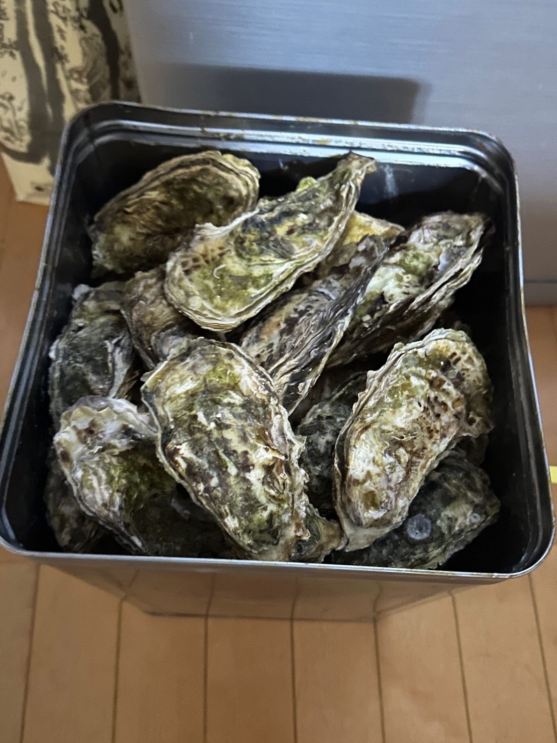 約80個の殻付きの牡蠣が、一斗缶にみっしり入って届きました。