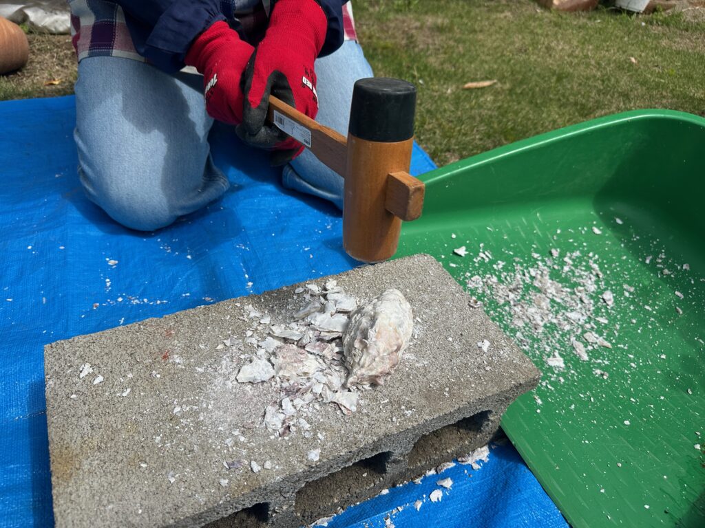 約3ヶ月放置し、からからになった蠣殻を、半日かけて砕きました。
