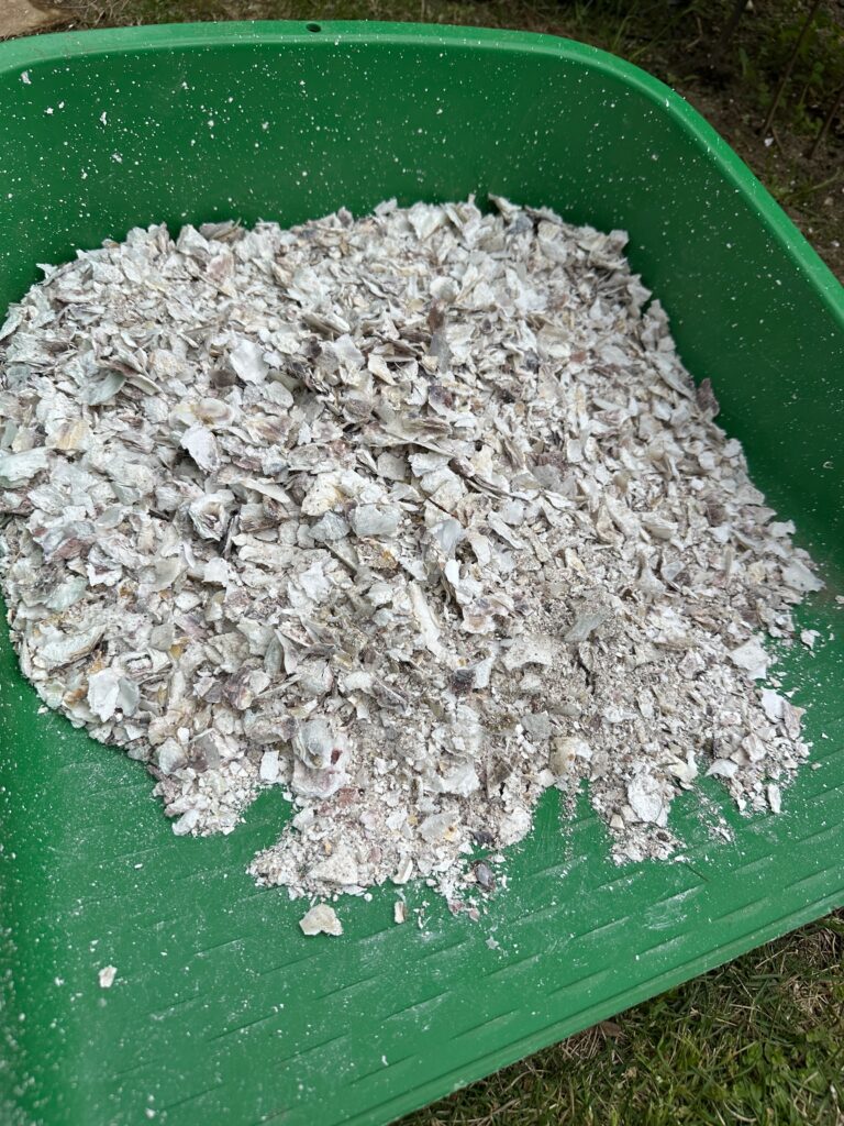 即効性はありませんが、じわじわと長く効いて土を健やかにしてくれる牡蠣殻肥料と自家製堆肥。