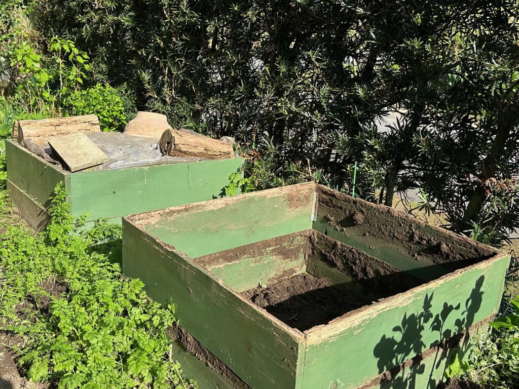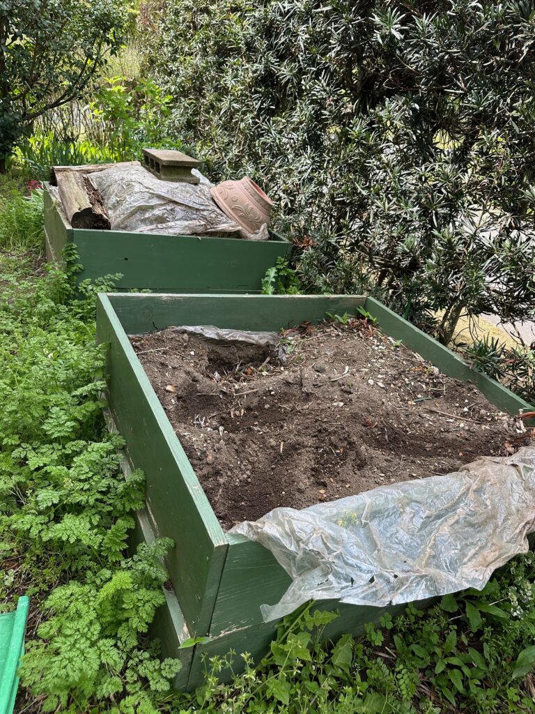 2021年に作った堆肥造り用の囲い。今回、左側の堆肥の元が山盛りいっぱいなので、右側の堆肥を使い切り、新たに、右側に生ゴミや草を投入していく場所を確保しました。